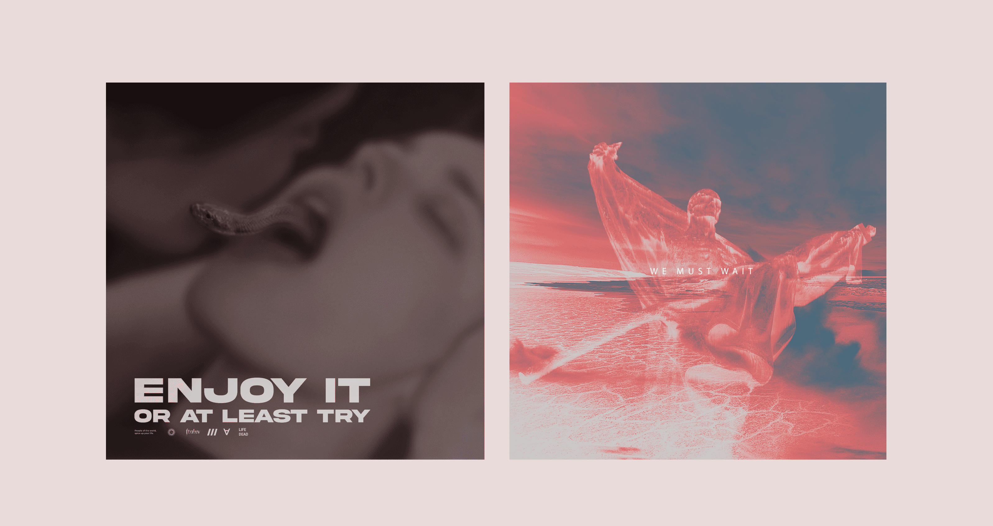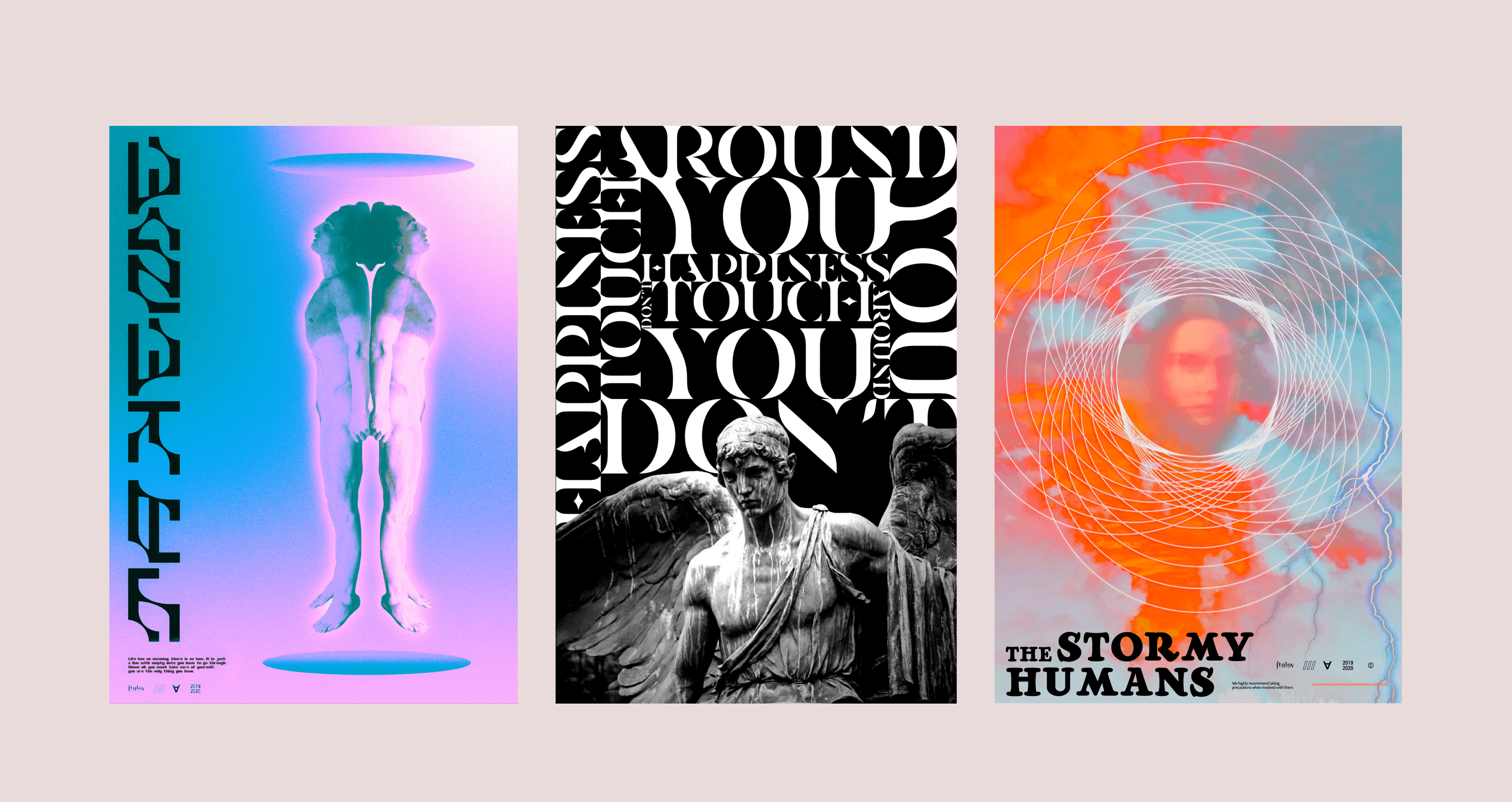 A diverse collection of posters created as an exercise in design and graphic production, drawing inspiration from artistic elements and thematic references such as music, films, violence, death, and loneliness.